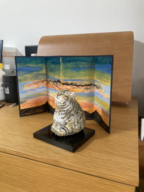 屛風に描いた風景の前で猫が座り、存在感を増していった。