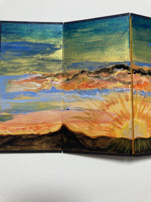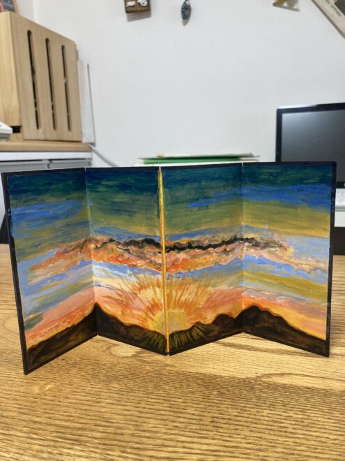 あるとき私は張り子作品のバックに小さい屛風絵を置く事を思いついた。