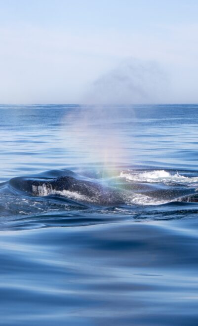 一頭のザトウクジラが船のすぐ隣に姿を現し、頭部にある鼻孔から息を勢いよく吐き出した。