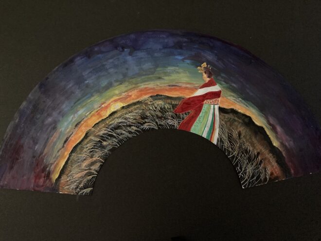 ※私が描いた扇絵。奈良時代の貴婦人がすすき野原に立つ姿を描くことで、万葉集時代の日本の原風景を表現している。