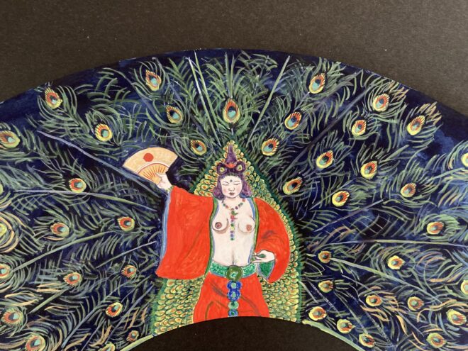 ※私が描いた扇絵。上掲と同じくまだ仕立てに出していないが、私なりの解釈で描いた吉祥弁財天である。