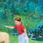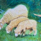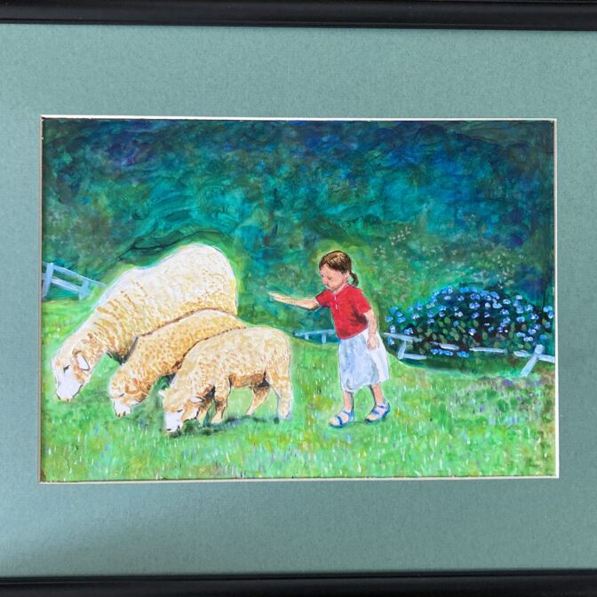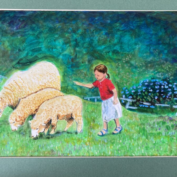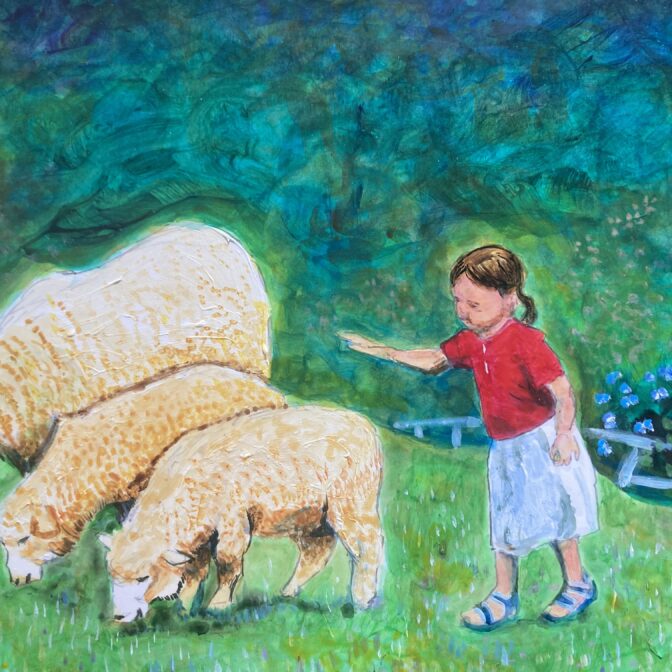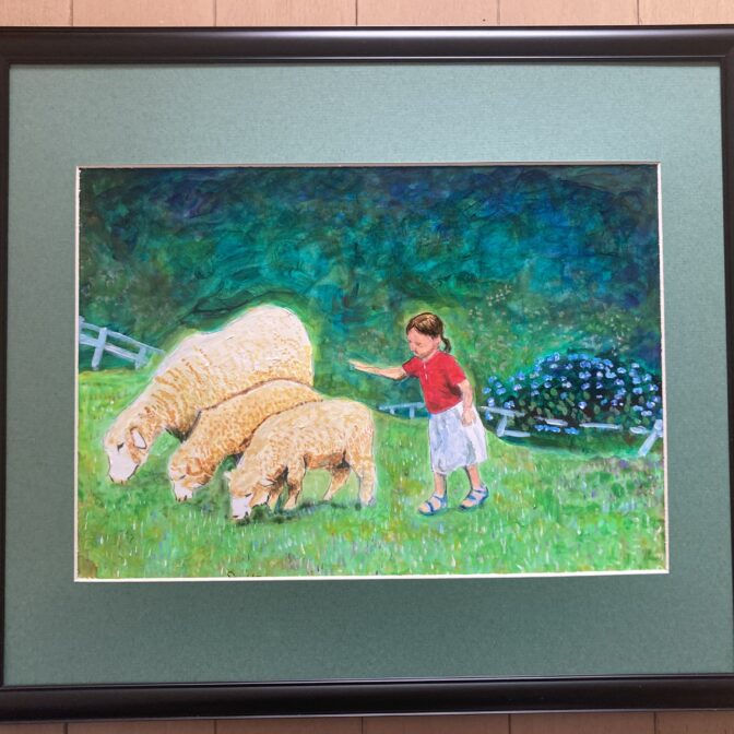 幼い娘が生まれて初めてみる羊におっかなびっくり触れようとしている好奇心と恐怖と、草原の薫りと、草木をゆらす風を表現しています。