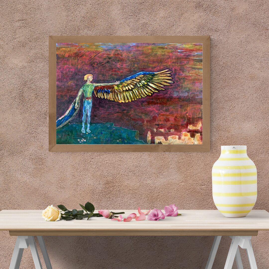 The image showing the artwork on the wall is a digital mockup.